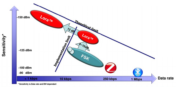 LoRa的诞生比NB-IoT要早些,2013年8月,Semtech公司向业界发布了一种新型的基于1GHz以下的超长距低功耗数据传输技术(Long Range,简称LoRa)的芯片。其接受灵敏度达到了惊人的-148dbm,与业界其他先进水平的sub-GHz芯片相比,最高的接收灵敏度改善了20db以上,这确保了网络连接可靠性。