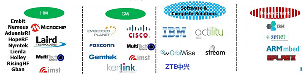LoRa的产业链中(包括终端硬件产商、芯片产商、模块网关产商、软件厂商、系统集成商、网络运营商)的每一环均有大量的企业,构成了LoRa的完整生态系统,促使了LoRa的快速发展与生态繁盛。