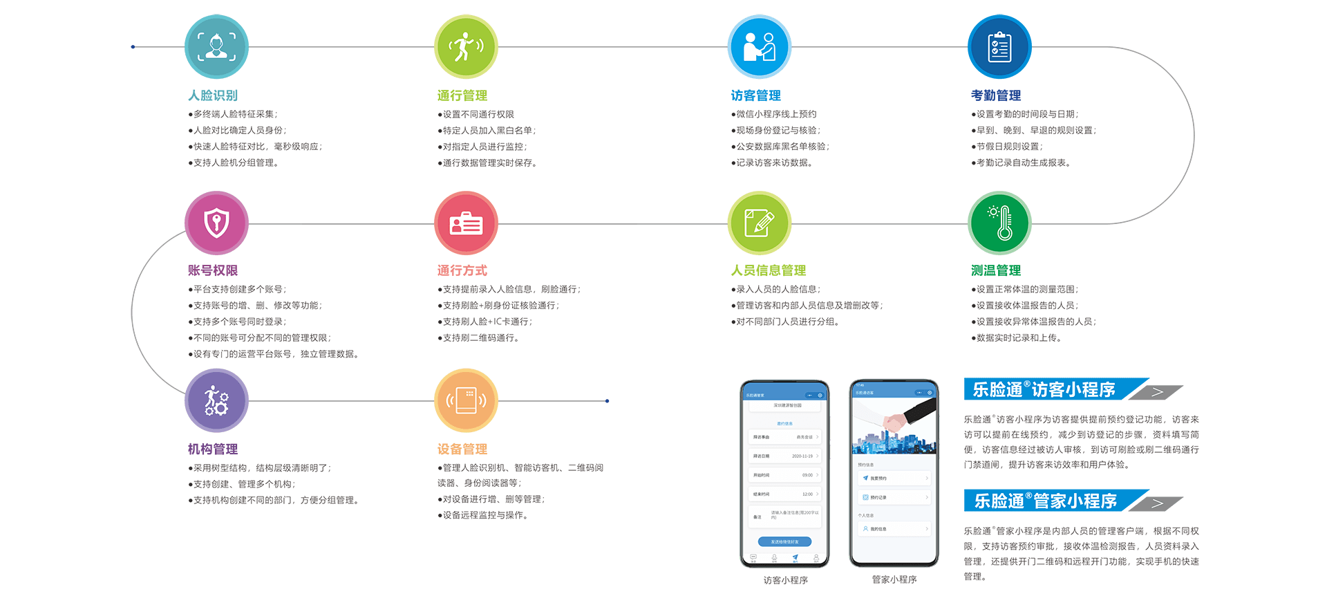 V7系列多功能智能访客一体机可以搭载小乐智能访客管理SaaS云平台,实现微信预约、刷脸、刷二维码和刷卡等快速通过闸机或门禁,实现人员登记、通行管理、访客管理、健康码状态核验、测温、考勤管理、智能门禁、身份验证等多个功能。