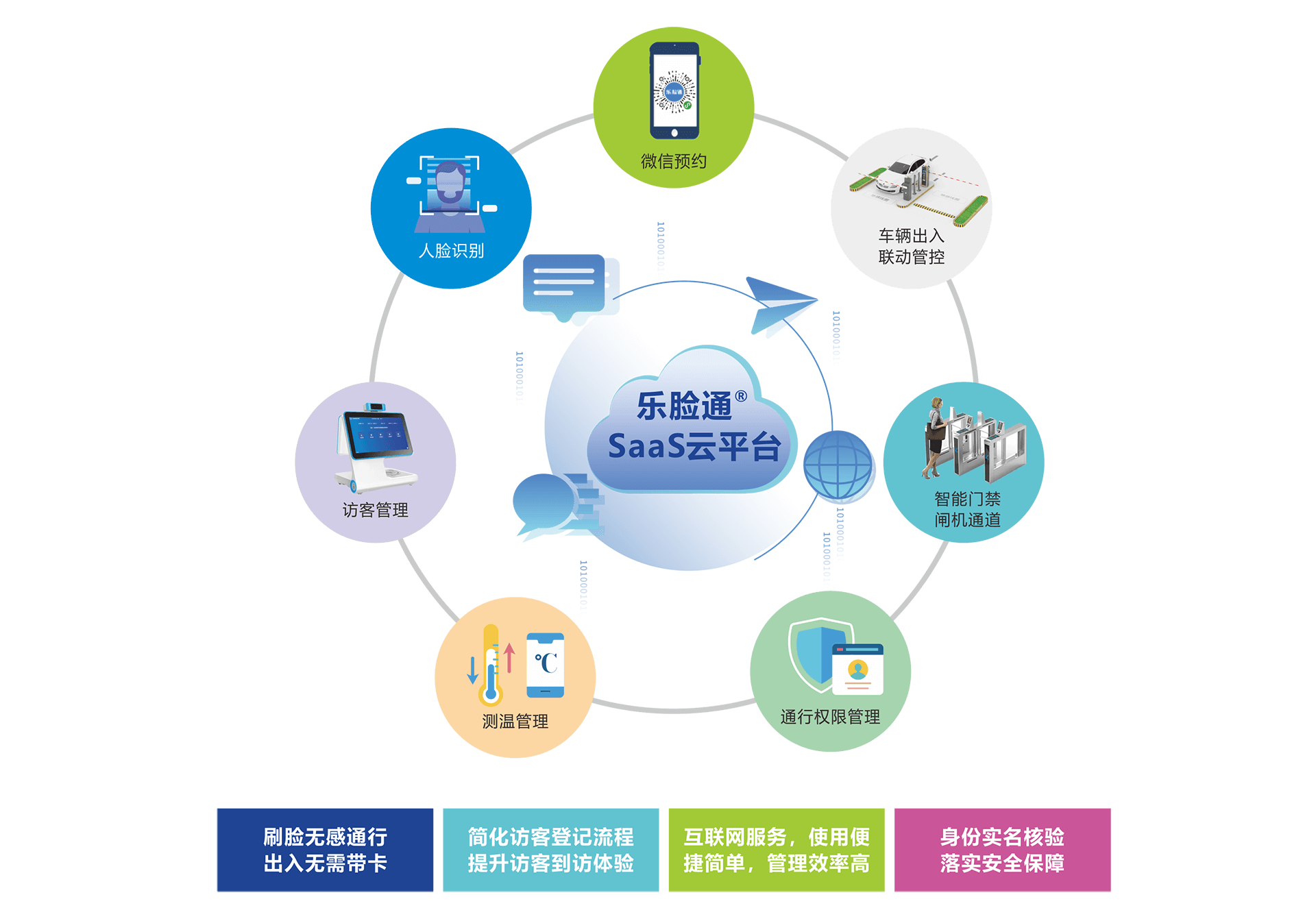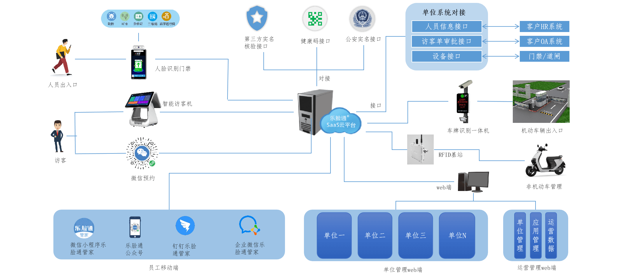 V7系列多功能智能访客一体机可以搭载乐脸通出入口人脸识别管理SaaS云平台,实现微信预约、刷脸、刷二维码和刷卡等快速通过闸机或门禁,实现人员登记、通行管理、访客管理、健康码状态核验、测温、考勤管理、智能门禁、身份验证等多个功能。