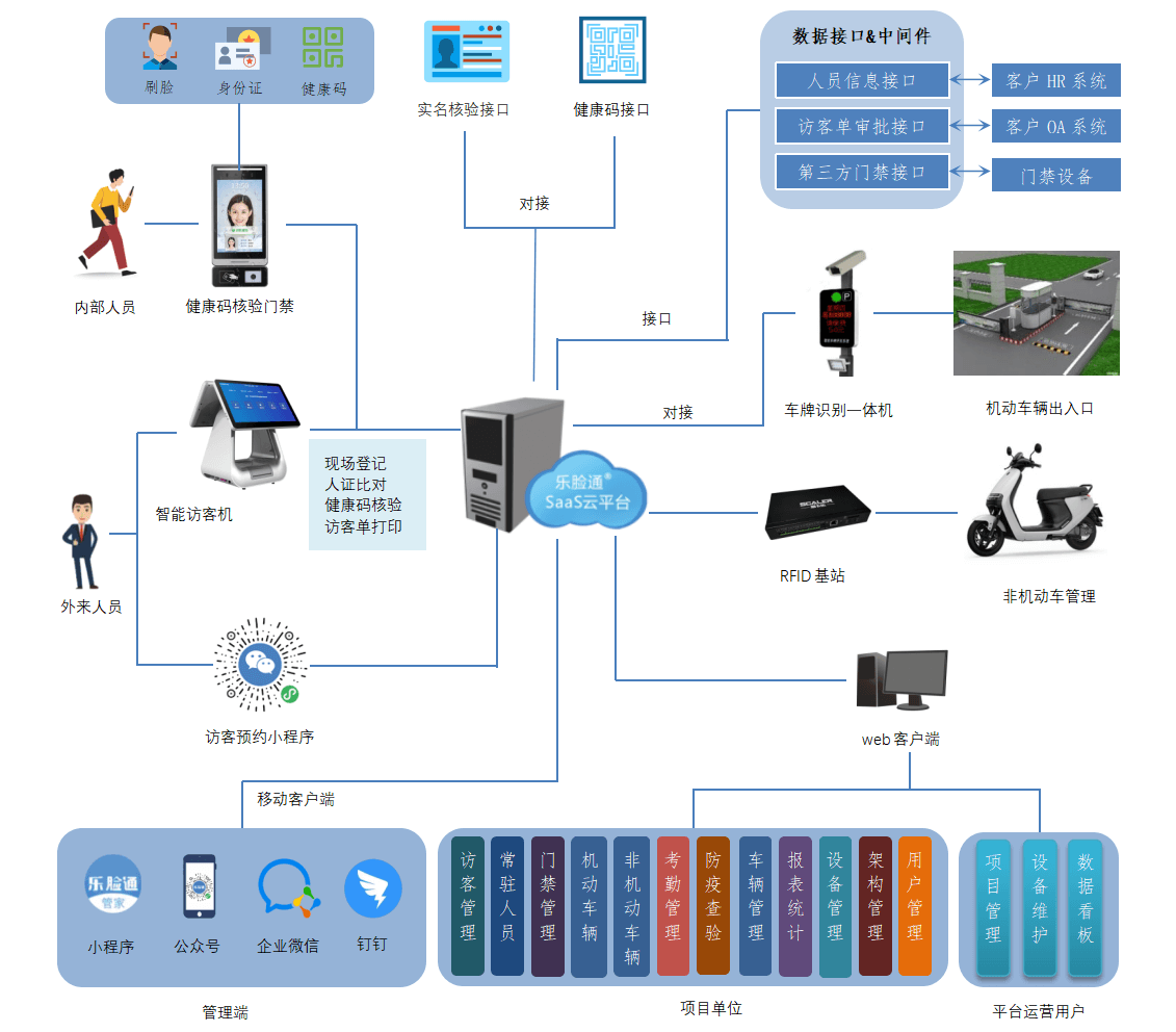 乐脸通AIoT疫情防控访客管理系统,以移动互联网、物联网、大数据、人工智能等新一代信息技术为支撑,支持对接相关国家健康大数据平台,具有集人脸识别(无需摘口罩)、智能测温、健康码核验、身份读取等多功能为一体的特点,可一次性完成体温检测、口罩佩戴检查、健康码状态、核酸检测时间、疫苗接种情况、记录人员身份信息等,对不合格人员进行自动报警拦截,有效落实好疫情防控期间“体温必测、口罩必戴、核酸必查”的管理制度。